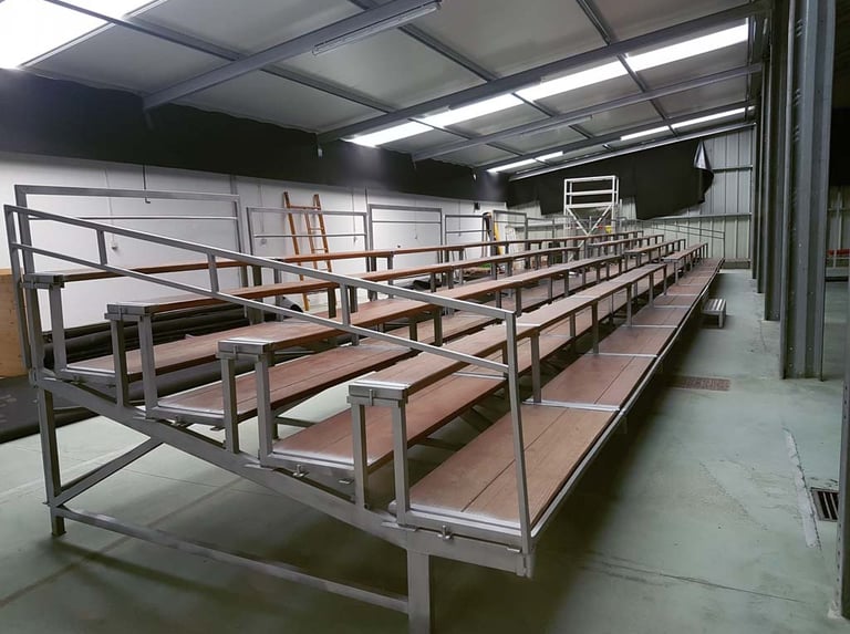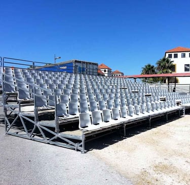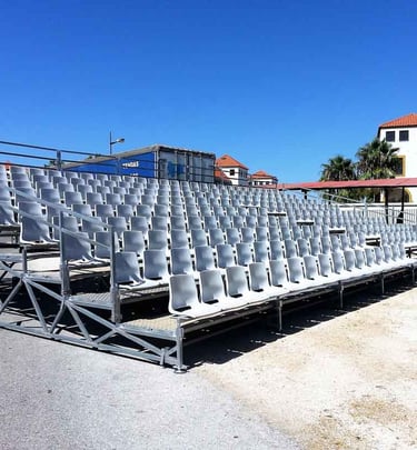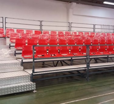 Alugamos bancadas de cadeiras, com cadeira individual para maior conforto, com passadiços antiderrapantes. Possibilidade de instalar ao nível do chão ou com elevação e passadiço frontal, com 5, 9 ou 13 filas conforme a lotação pretendida.